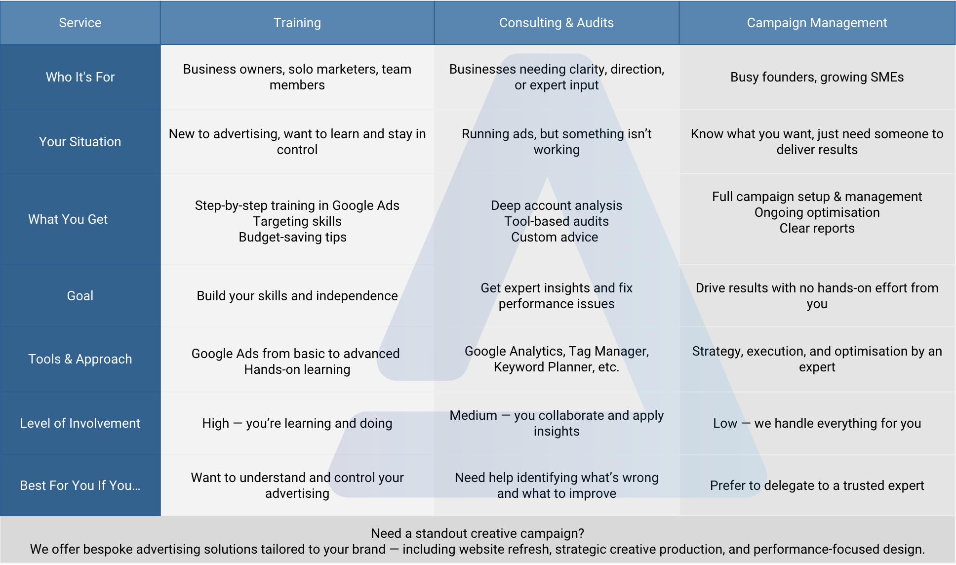 Use the table below to compare our services and find the best fit for your goals, budget, and level of involvement.
